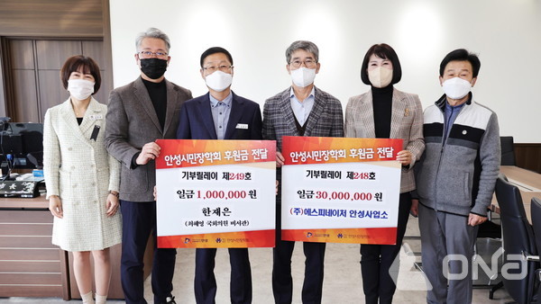(안성=열린뉴스통신) 정양수 기자 = 안성시민장학회는 4일 ㈜에스피네이처 안성사업소로부터 장학금 3000만원을, 한재은 전 청소년선도위원회 안성시지부장으로부터 장학금 100만원을 각각 기부받았다.
