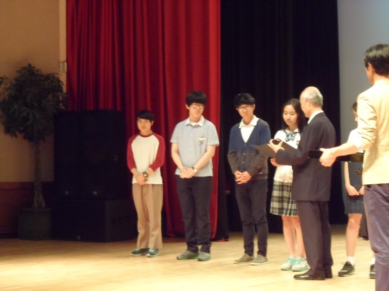 장학생으로 선발된 중학교 대표자들이 안성시민장학회 박종권이사로부터 장학증서를 받고 있다