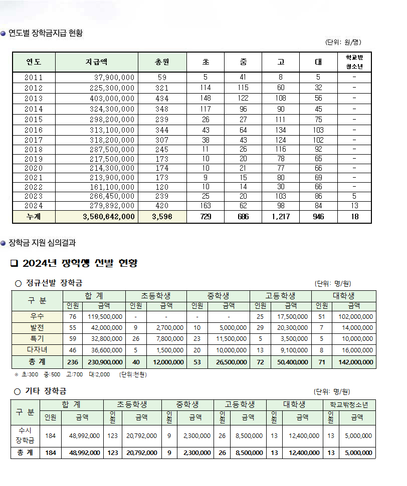 연도별 장학금 지원현황